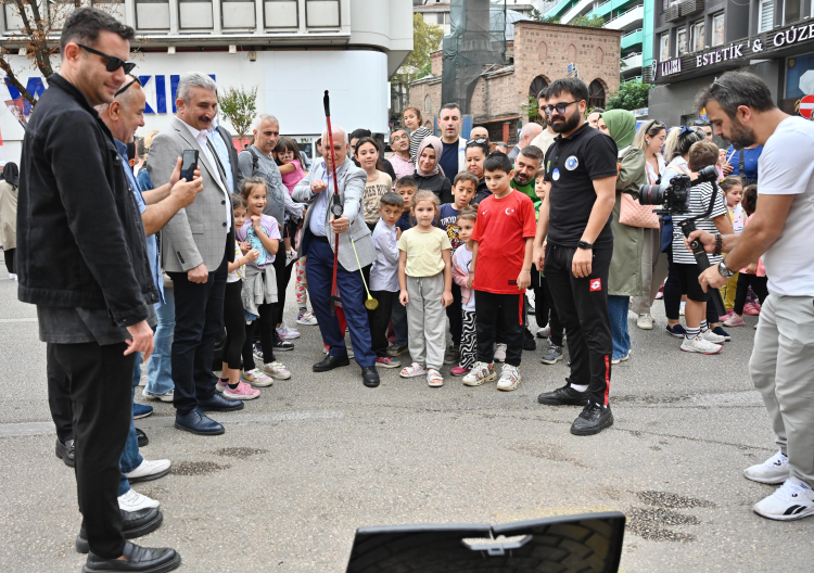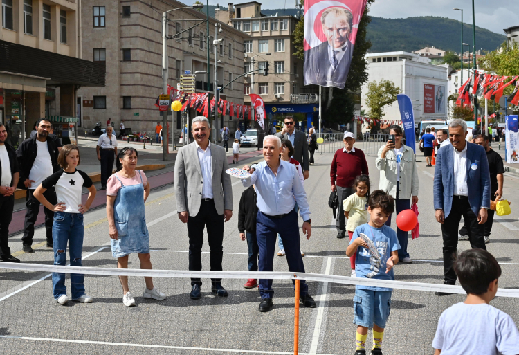 Bursa’da, Avrupa Hareketlilik Haftası etkinlikleri kapsamında araç trafiğine kapatılan Heykel Atatürk Caddesi, çocuk sesleriyle şenlendi. Kendileri için hazırlanan oyun alanlarında doyasıya eğlenen çocuklara, Başkan Mustafa Bozbey de katılarak sevinçlerine ortak oldu. Başkan Bozbey, “Amacımız, 3 merkez ilçemizde birer caddemizi, Pazar günleri yayaların kullanımına sunmak” dedi.