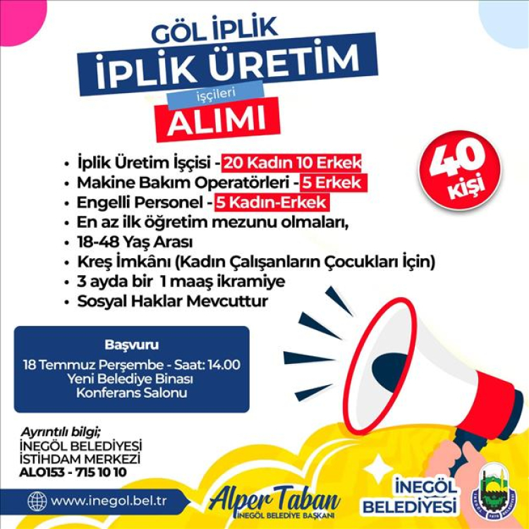İnegöl Belediyesi İstihdam Merkezinden yapılan açıklamada, Organize Sanayi Bölgesinde faaliyetini sürdüren Göliplik firmasında çalışmak üzere personel alımı yapılacağı duyuruldu. Açıklamada şu ifadelere yer verildi: “İstihdam Merkezimizle iş birliği yapan Göliplik firması; iplik üretim işçisi, makine bakım operatörü ve engelli personel olmak üzere farklı alanlarda personel alımı yapacağını duyurdu. İplik üretim işçisi olarak 20 kadın 10 erkek olmak üzere toplam 30, makine bakım operatörü olarak 5 erkek ve engelli personel olarak da kadın veya erkek 5 personel alımı yapılacak. Firmada çalışacak personellerde aranan genel özellikler ise; 18-48 yaş arası ve en az ilköğretim mezunu olmak. Kadın çalışanların çocukları için kreş imkanının sağlandığı firmada, 3 ayda bir maaş ikramiye ve sosyal haklar da mevcut.”