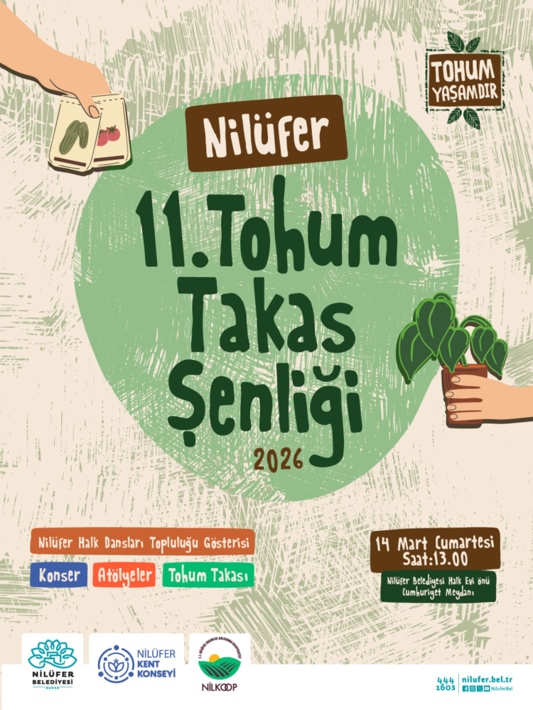 Nilüfer Belediyesi, Nilüfer Kent Konseyi ve Nilüfer Tarımsal Kalkınma Kooperatifi iş birliğiyle düzenlenecek 11. Tohum Takas Şenliği için geri sayım başladı. Yerel tarımı desteklemek ve tohum çeşitliliğinin önemine dikkat çekmek amacıyla düzenlenen etkinlikte, 14 Mart Cumartesi günü Nilüfer Belediyesi Halk Evi önünde yapılacak.