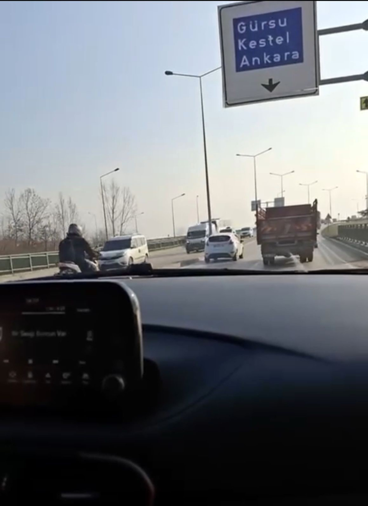 Bursa'da seyir halindeki otomobilde bulunan bir vatandaş, sosyal medya için görüntü çekmeye başladı. Telefonuyla kayda giren vatandaş, bir motosikletlinin kaza anını kayıt altına aldı. Kaza anı saniye saniye kaydedildi.