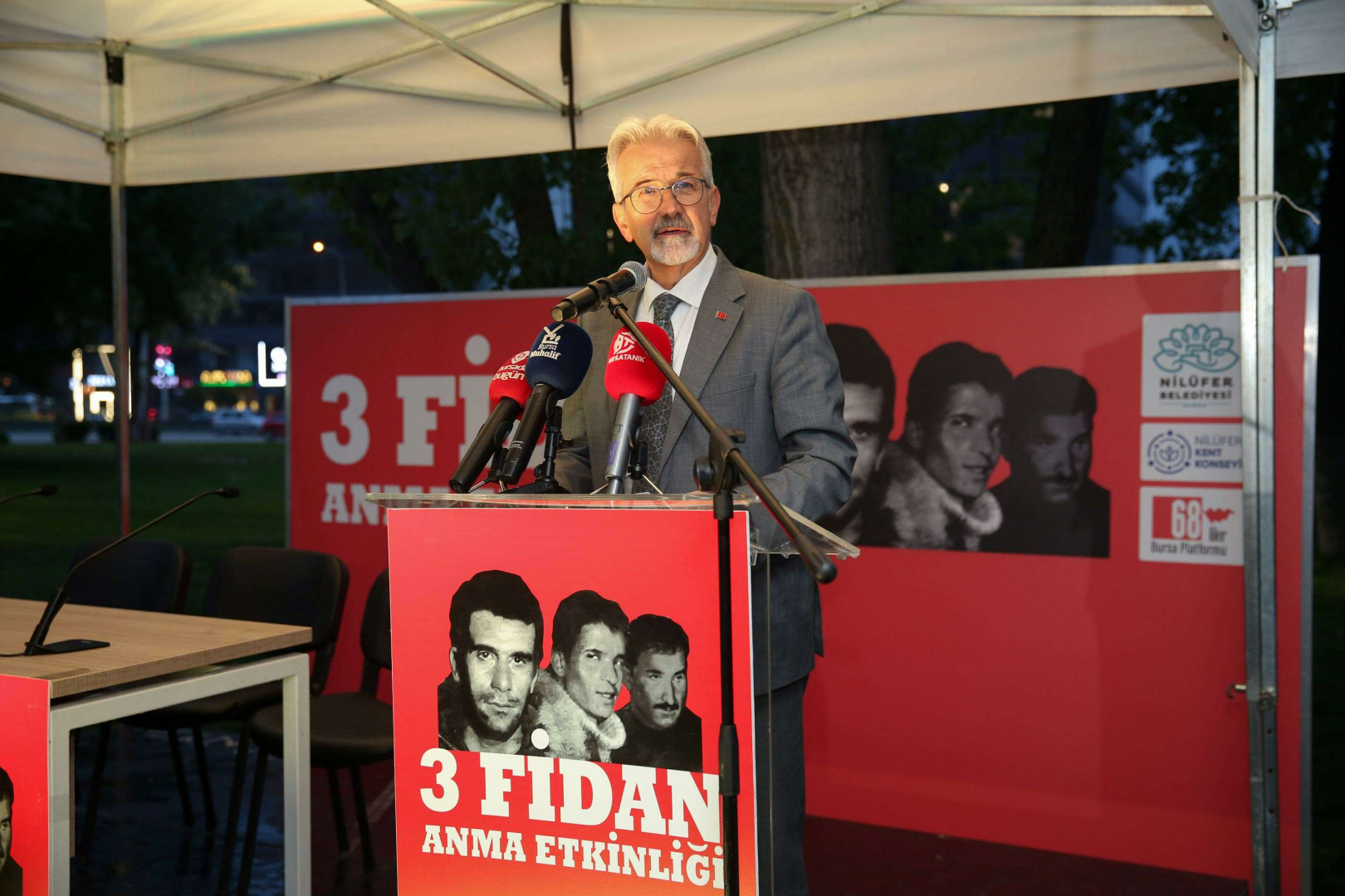 Türkiye’de devrimci hareketin sembollerinden olan, bağımsızlık uğruna gösterdikleri mücadele ruhu ve fikirleriyle geleceğe ışık tutan “3 Fidan”, Deniz Gezmiş, Hüseyin İnan ve Yusuf Aslan, idam edilişlerinin 51. yılında Nilüfer’de anıldı. Nilüfer Belediyesi, Nilüfer Kent Konseyi ve 68’liler Bursa Platformu tarafından Üç Fidan Gençlik Parkı’nda düzenlenen anma programına Nilüfer Belediye Başkanı Turgay Erdem, CHP Nilüfer İlçe Başkanı Fırat Yılmaz ile CHP Bursa Milletvekilleri ve Nilüfer Kent Konseyi Başkanı Neslihan Binbaş da katıldı.