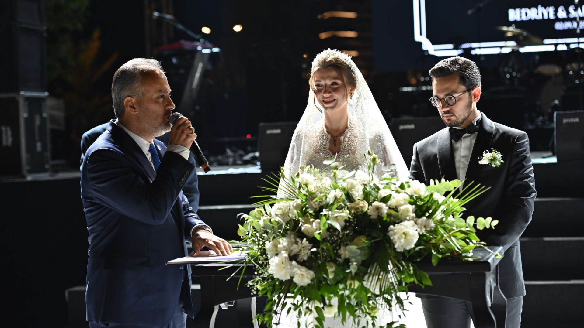 Bursa Büyükşehir Belediye Başkanı Alinur Aktaş’ın oğlu Safa Hilmi Aktaş, Bedriye Taç ile Gökmen Uzay Havacılık Eğitim Merkezi (GUHEM)’de gerçekleşen görkemli törenle hayatlarını birleştirdi. Siyaset ve iş dünyasından önemli isimlerin yer aldığı törene 4 bin 500 kişi katıldı. Muradiye Cami İmam Hatibi Lütfü Taş’ın okuduğu Kur’an-ı Kerim tilaveti sonrası nikah törenine geçildi. Genç çiftin nikahını ise Bursa Büyükşehir Belediye Başkanı Alinur Aktaş kıydı. Yıldırlar görevi gereği binlerce nikah kıyan Başkan Aktaş, bu kez oğluna nikah kıymanın mutluluğunu yaşadı