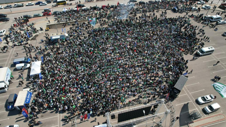 TFF 3. Lig'in 28. hafta mücadelesinde Bursaspor, Balıkesir'de Artvin Hopaspor ile karşı karşıya geldi. Maçın ilk yarısı 1-1 berabere tamamlanırken, yeşil-beyazlı ekip galip gelmesi durumunda şampiyonluğunu ilan edecek. Taraftarlar için Bursa'nın çeşitli yerlerine dev ekranlar kurulurken, Acemler İstasyonu Otoparkı'na kurulan dev ekranda da Bursalılar maçı takip etti. Şampiyonluk coşkusu ile ellerinde atkıyla alana gelenler maçın ikinci yarısını heyecanla bekliyor. Yüzlerce taraftarın oluşturduğu kalabalık dron ile havadan görüntülendi.