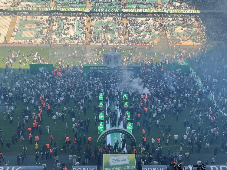 Kupa töreni sırasında binlerce taraftar sahaya inince görüntüler Bursaspor'un Süper Lig şampiyonluğunu akıllara getirdi.